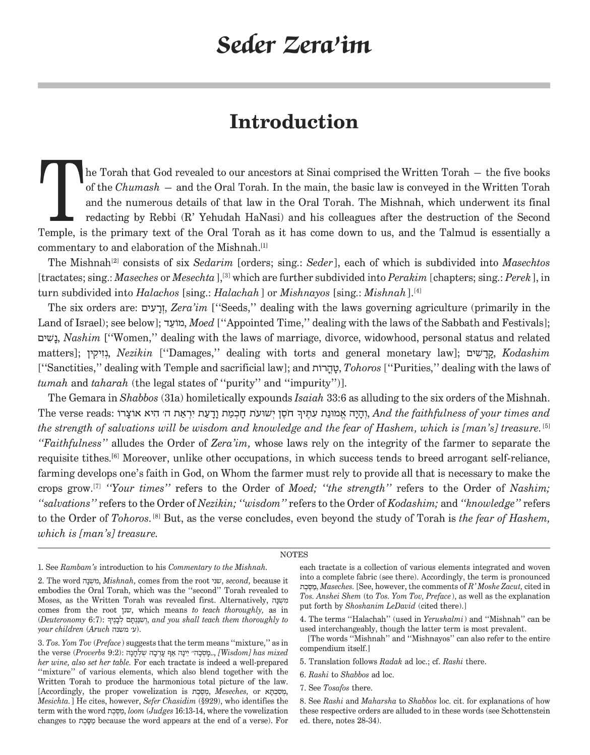 Each of the six Orders (Sedarim) of the Mishnah begins with a comprehensive introduction. For example, the introduction to Seder Zera'im (the Order of Seeds) explains: